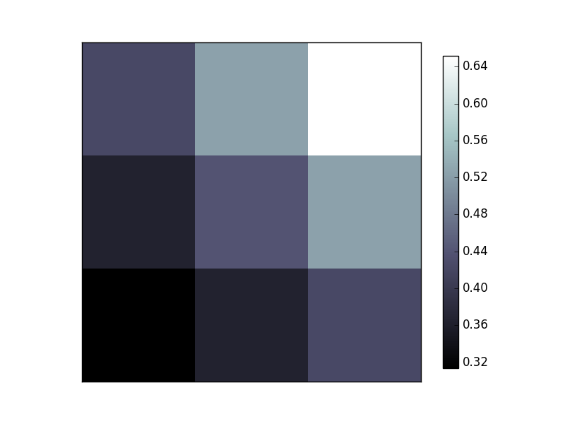 三行三列的格子,a代表每一个值,图像右边有一个注释,白色代表值最大的地方,颜色越深值越小。