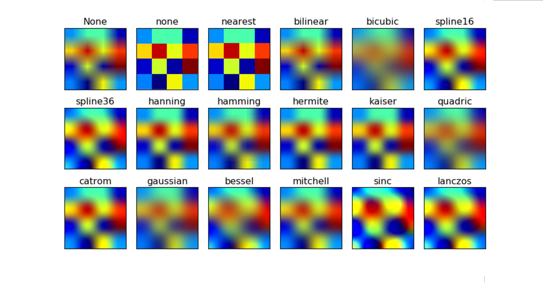 我们在这个链接 可以看到matplotlib官网上对于内插法的不同方法的描述。下图是一个示例: