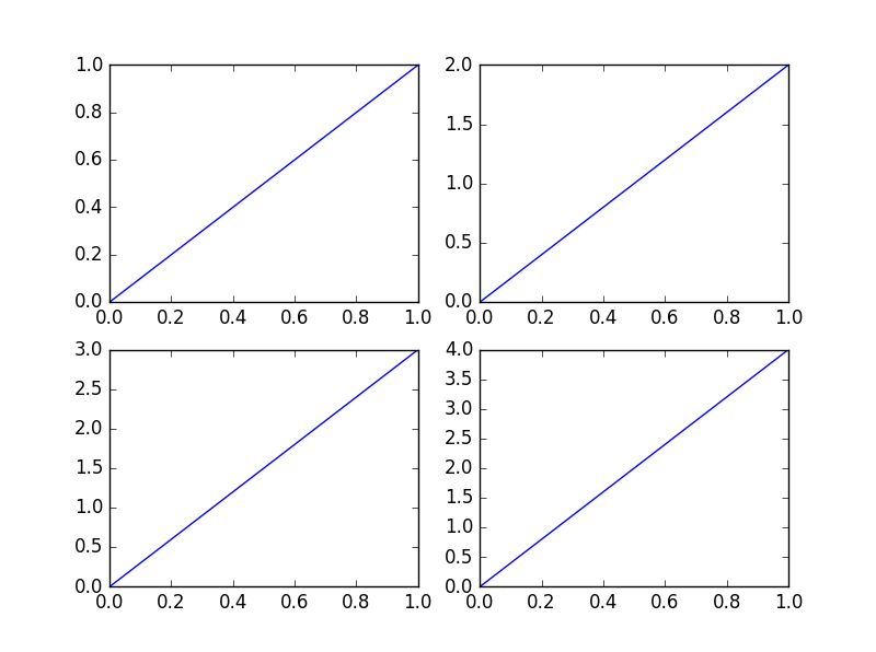 使用plt.subplot来创建小图. plt.subplot(2,2,1)表示将整个图像窗口分为2行2列, 当前位置为1. 使用plt.plot([0,1],[0,1])在第1个位置创建一个小图.