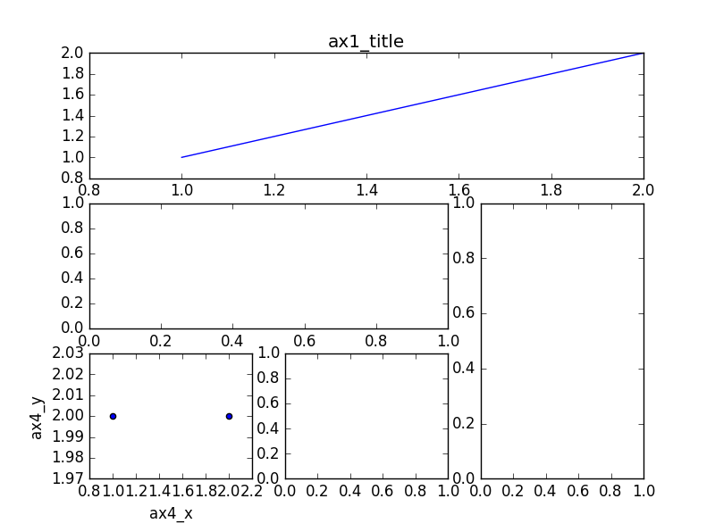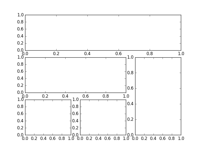 同上画出 ax3, (1,2)表示从第1行第2列开始作图,rowspan=2表示行的跨度为2. 再画一个 ax4 和 ax5, 使用默认 colspan, rowspan.