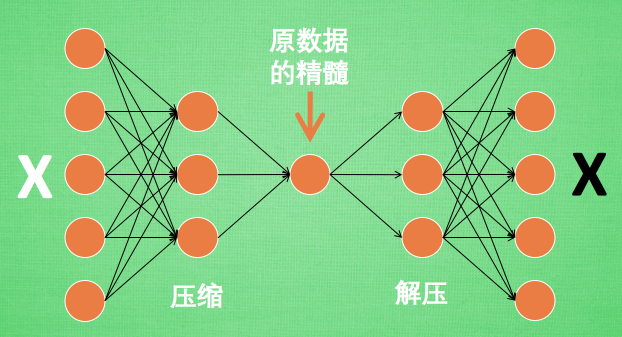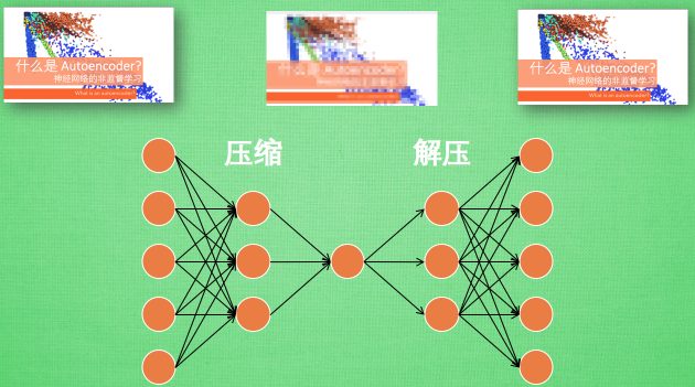 假设刚刚那个神经网络是这样, 对应上刚刚的图片, 可以看出图片其实是经过了压缩,再解压的这一道工序. 当压缩的时候, 原有的图片质量被缩减, 解压时用信息量小却包含了所有关键信息的文件恢复出原本的图片. 为什么要这样做呢?