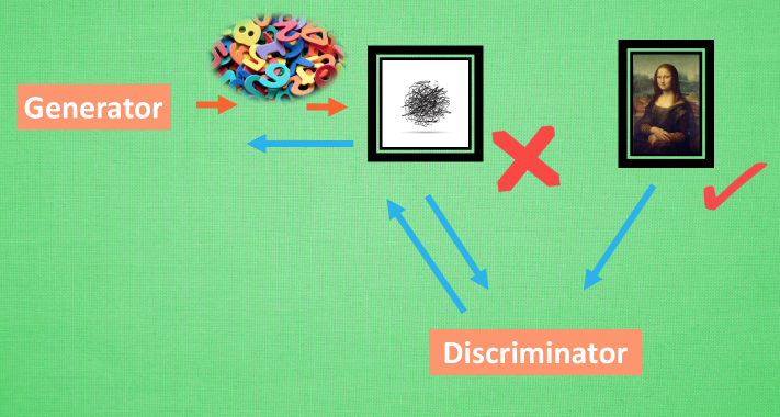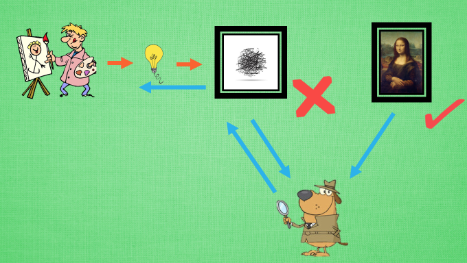 新手画家用随机灵感画画 , 新手鉴赏家会接收一些画作, 但是他不知道这是新手画家画的还是著名画家画的, 他说出他的判断, 你来纠正他的判断, 新手鉴赏家一边学如何判断, 一边告诉新手画家要怎么画才能画得更像著名画家, 新手画家就能学习到如何从自己的灵感画出更像著名画家的画了. GAN 也就这么回事.