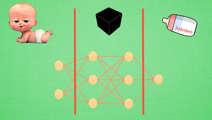 输入端, 黑盒, 输出端. 输入端是我们能理解的物体, 一个宝宝, 输出端也是一个我们能理解的物体, 一个奶瓶. 对于神经网络, 传统的理解就是, 中间的这两层神经层在对输入信息进行加工, 好让自己的输出信息和奶瓶吻合. 但是我们如果换一个角度来想想. 此时, 我们将左边的红线移动一下