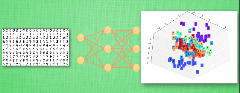 然后我们将这个神经网络的输出层给拆掉, 只留下前三层, 那第3层输出的信息就是我们这些数字的3个最重要的代表特征, 换句话说, 就是用3个信息来代表整张手写数字图片的所有像素点. 我们如果把这3个信息展示出来, 我们就能很清楚的看到, 计算机是如何用3个点来代表不同的数字内容, 比如神经网络认为 1 和 0 是完全不同的, 所以他们应该被放在空间里不同的地方. 输出层就更好理解了,