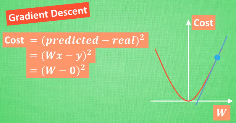 比如说牛顿法 (Newton’s method), 最小二乘法(Least Squares method), 梯度下降法 (Gradient Descent) 等等. 而我们的神经网络就是属于梯度下降法这个分支中的一个. 提到梯度下降, 我们不得不说说大学里面学习过的求导求微分. 因为这就是传说中”梯度下降”里面的”梯度” (gradient)啦. 听到求导微分可别后怕, 因为这个短视频只是让你有一个直观上的理解, 并不会涉及太过复杂的东西.