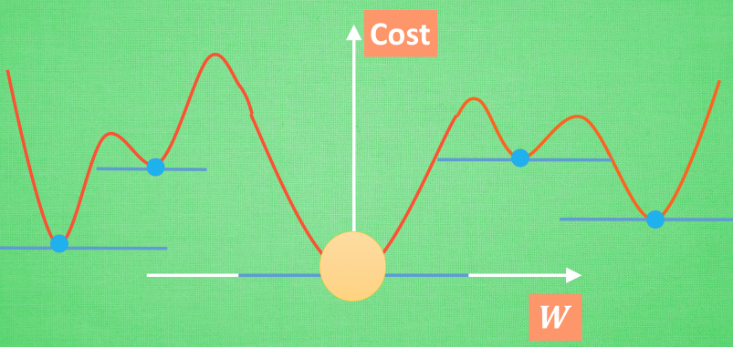 在简化版的误差曲线中, 我们只要找到梯度线躺平的地方, 就能能迅速找到误差最小时的 W. 可是很多情况是这样的, 误差曲线并不只有一个沟, 而且梯度躺平的点也不止一个. 不同的 W 初始化的位置, 将会带来不同的下降区域. 不同的下降区域, 又会带来不同的 W 解. 在这个图像当中, W 的全局最优解(Global minima)在这个位置, 而其它的 解都是局部最优(Local minima). 全局最优固然是最好, 但是很多时候, 你手中的都是一个局部最优解, 这也是无可避免的. 不过你可以不必担心, 因为虽然不是全局最优, 但是神经网络也能让你的局部最优足够优秀, 以至于即使拿着一个局部最优也能出色的完成手中的任务.