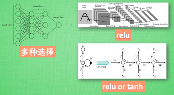 最后我们说说, 在具体的例子中, 我们默认首选的激励函数是哪些. 在少量层结构中, 我们可以尝试很多种不同的激励函数. 在卷积神经网络 Convolutional neural networks 的卷积层中, 推荐的激励函数是 relu. 在循环神经网络中 recurrent neural networks, 推荐的是 tanh 或者是 relu (这个具体怎么选, 我会在以后 循环神经网络的介绍中在详细讲解).