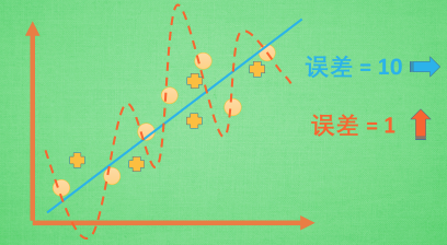 机器学习模型的自负又表现在哪些方面呢. 这里是一些数据. 如果要你画一条线来描述这些数据, 大多数人都会这么画. 对, 这条线也是我们希望机器也能学出来的一条用来总结这些数据的线. 这时蓝线与数据的总误差可能是10. 可是有时候, 机器过于纠结这误差值, 他想把误差减到更小, 来完成他对这一批数据的学习使命. 所以, 他学到的可能会变成这样 . 它几乎经过了每一个数据点, 这样, 误差值会更小 . 可是误差越小就真的好吗? 看来我们的模型还是太天真了. 当我拿这个模型运用在现实中的时候, 他的自负就体现出来. 小二, 来一打现实数据 . 这时, 之前误差大的蓝线误差基本保持不变 .误差小的 红线误差值突然飙高 , 自负的红线再也骄傲不起来, 因为他不能成功的表达除了训练数据以外的其他数据. 这就叫做过拟合. Overfitting.
