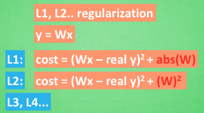 运用正规化. L1, l2 regularization等等, 这些方法适用于大多数的机器学习, 包括神经网络. 他们的做法大同小异, 我们简化机器学习的关键公式为 y=Wx . W为机器需要学习到的各种参数. 在过拟合中, W 往往变化率比较大. 为了不让W一次性变化太大, 我们在计算误差上做些手脚. 原始的 cost 误差是这样计算 , cost = 预测值-真实值的平方. 如果 W 变得太大, 我们就让 cost 也跟着变大, 变成一种惩罚机制. 所以我们把 W 自己考虑进来 . 这里 abs 是绝对值. 这一种形式的 正规化, 叫做 l1 正规化. L2 正规化和l1 类似, , 只是绝对值换成了平方. 其他的l3.l4 也都是换成了立方和4次方等等. 形式类似. 用这些方法,我们就能保证让学出来的线条不会过于扭曲.