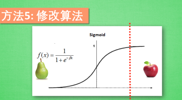 这个简介视频的最后一种方法是让自己变得有创造力, 尝试修改算法. 如果你用的是 Sigmoid 的激励函数, activation function, 他会有一个预测门槛, 一般如果输出结果落在门槛的这一段,预测结果为梨, 如果落在这一段, 预测结果为苹果, 不过因为现在的梨是多数派, 我们得调整一下门槛的位置, 使得门槛偏向苹果这边, 只有很自信的时候, 模型才会预测这是苹果. 让机器学习,学习到更好的效果.