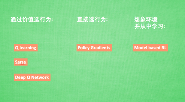 强化学习是一个大家族, 他包含了很多种算法, 我们也会一一提到之中一些比较有名的算法, 比如有通过行为的价值来选取特定行为的方法, 包括使用表格学习的 q learning, sarsa, 使用神经网络学习的 deep q network, 还有直接输出行为的 policy gradients, 又或者了解所处的环境, 想象出一个虚拟的环境并从虚拟的环境中学习 等等.