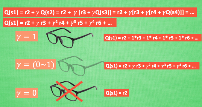 我们重写一下 Q(s1) 的公式, 将 Q(s2) 拆开, 因为Q(s2)可以像 Q(s1)一样,是关于Q(s3) 的, 所以可以写成这样, 然后以此类推, 不停地这样写下去, 最后就能写成这样, 可以看出Q(s1) 是有关于之后所有的奖励, 但这些奖励正在衰减, 离 s1 越远的状态衰减越严重. 不好理解? 行, 我们想象 Qlearning 的机器人天生近视眼, gamma = 1 时, 机器人有了一副合适的眼镜, 在 s1 看到的 Q 是未来没有任何衰变的奖励, 也就是机器人能清清楚楚地看到之后所有步的全部价值, 但是当 gamma =0, 近视机器人没了眼镜, 只能摸到眼前的 reward, 同样也就只在乎最近的大奖励, 如果 gamma 从 0 变到 1, 眼镜的度数由浅变深, 对远处的价值看得越清楚, 所以机器人渐渐变得有远见, 不仅仅只看眼前的利益, 也为自己的未来着想.