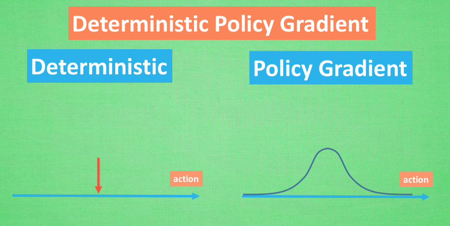 Policy gradient 我们也在之前的短片中提到过, 相比其他的强化学习方法, 它能被用来在连续动作上进行动作的筛选 . 而且筛选的时候是根据所学习到的动作分布随机进行筛选, 而 Deterministic 有点看不下去, Deterministic 说: 我说兄弟, 你其实在做动作的时候没必要那么不确定, 那么犹豫嘛, 反正你最终都只是要输出一个动作值, 干嘛要随机, 铁定一点, 有什么不好. 所以 Deterministic 就改变了输出动作的过程, 斩钉截铁的只在连续动作上输出一个动作值.