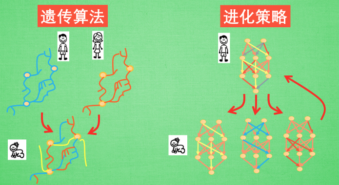 我们之前提过了两种方式, 遗传算法 (Genetic Algorithm) 和 进化策略 (Evolution Strategy). 这两种方式的神经网络都有了突破性的发展. 像这部影片一样, 我也制作过遗传算法和进化策略的短简介, 确保你已经观看过了以上两部简介视频, 因为在这部影片中, 我们会基于之前两部影片来理解. 不管是遗传算法还是进化策略, 他们都是采取了进化理论中的某些重要部分. 比如遗传算法中我们会有来自父母的两组神经网络, 通过将这两个神经网络交叉配对, 产生宝宝的神经网络, 然后将宝宝的神经网络变异, 来获取新的能力. 最后将所有宝宝们放入残酷的现实, 让他们适者生存不适者淘汰. 而如果使用进化策略, 我们更偏向于先固定神经网络的结构, 让这个结构蚕卵, 生出很多和原始神经网络结构相同, 但联结强度稍稍不同的网络. 这些宝宝网络中肯定有好有坏, 进化策略中有趣的一步就来了, 下一代的爸爸是所有宝宝的综合体, 这个综合体中, 好宝宝的联结会占有更多比例, 坏宝宝占有更少比例. 通过这种形式让好宝宝渐渐主宰这个生存环境. 我们知道, 反向传播, 靠计算梯度的神经网络非常适合做监督学习, 比如让计算机识别图片, 在这方面, 使用进化理论的神经网络的确暂时比不上这些梯度的神经网络. 原因很简单.