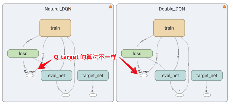 接着我们来修改 learn() 中的代码. 我们对比 Double DQN 和 Natural DQN 在 tensorboard 中的图,