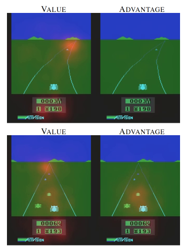 它分成了这个 state 的值, 加上每个动作在这个 state 上的 advantage. 因为有时候在某种 state, 无论做什么动作, 对下一个 state 都没有多大影响. 比如 paper 中的这张图.
