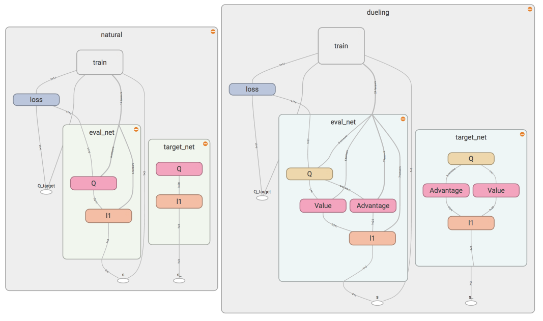 只要稍稍修改 DQN 中神经网络的结构, 就能大幅提升学习效果, 加速收敛. 这种新方法叫做 Dueling DQN. 用一句话来概括 Dueling DQN 就是. 它将每个动作的 Q 拆分成了 state 的 Value 加上 每个动作的 Advantage.