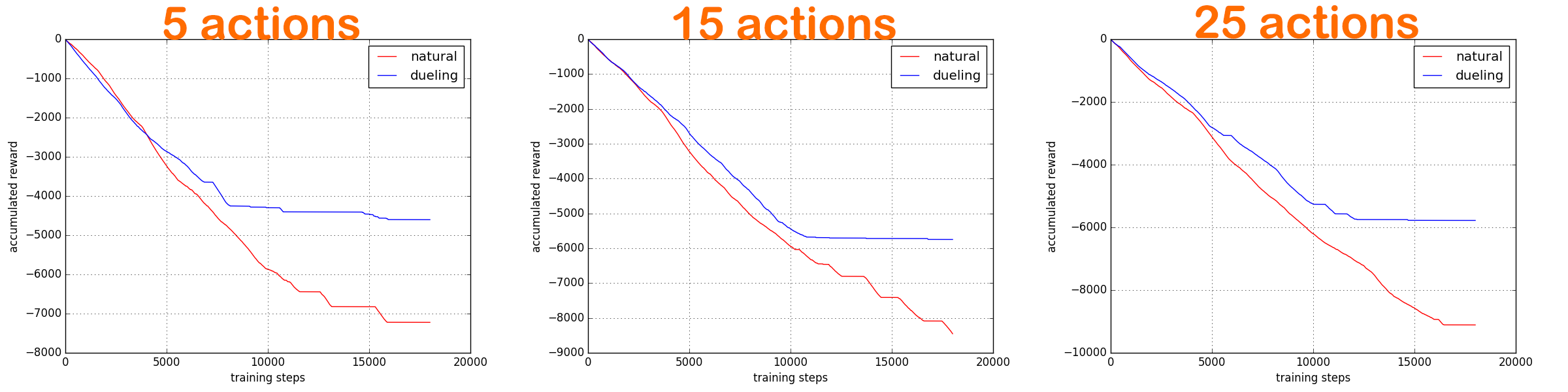 我们发现当可用动作越高, 学习难度就越大, 不过 Dueling DQN 还是会比 Natural DQN 学习得更快. 收敛效果更好.