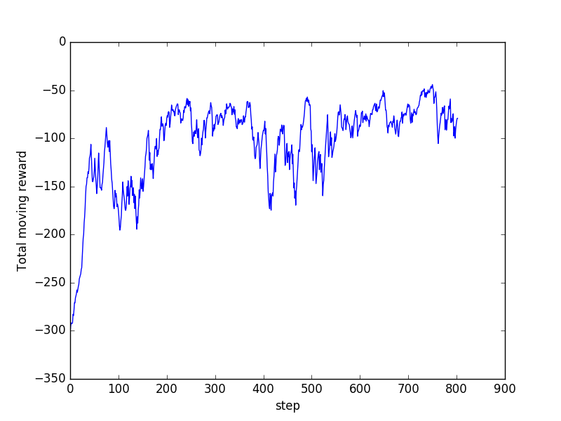我的电脑里可以建立 4个 worker, 也就可以把它们放在4个线程中并行探索更新. 最后的学习结果可以用这个获取 moving average 的 reward 的图来概括.