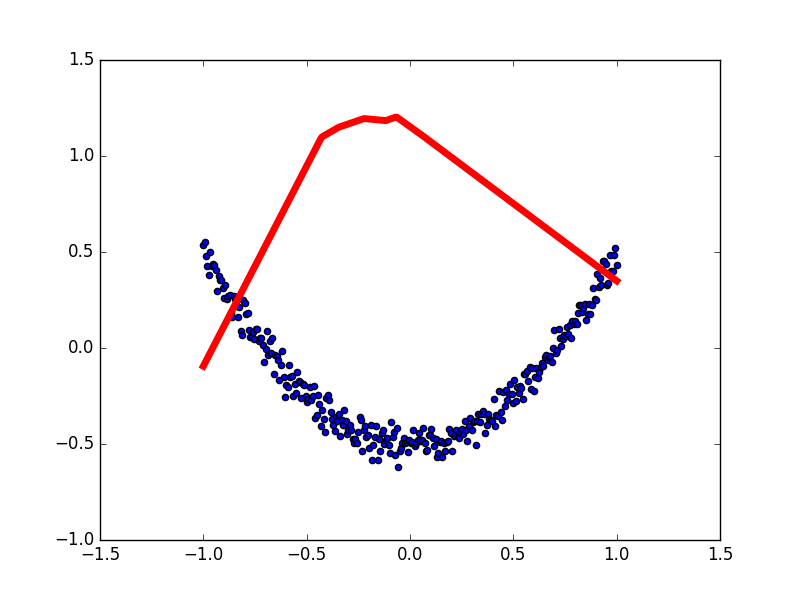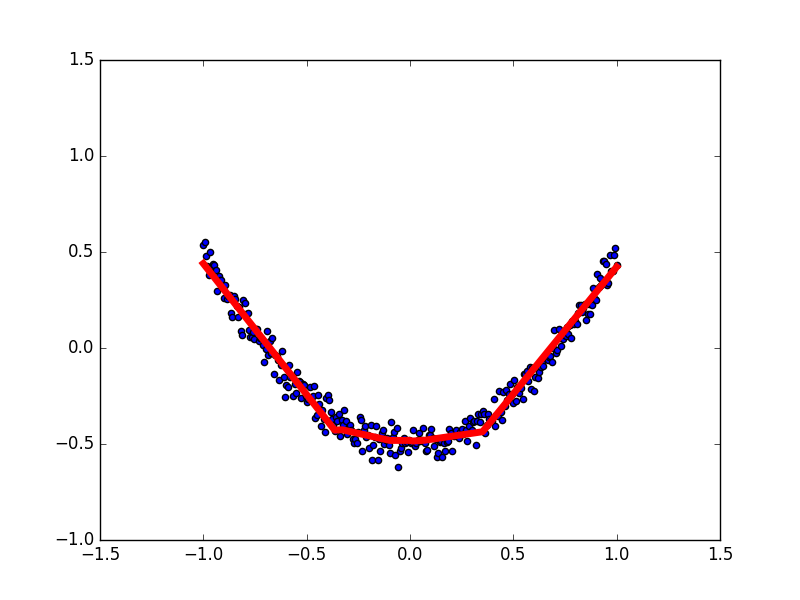 本例中蓝色离散点是我们的数据点, 红线是通过神经网络算法拟合出来的曲线,