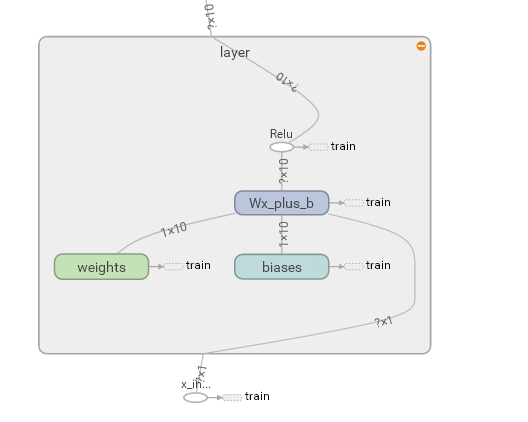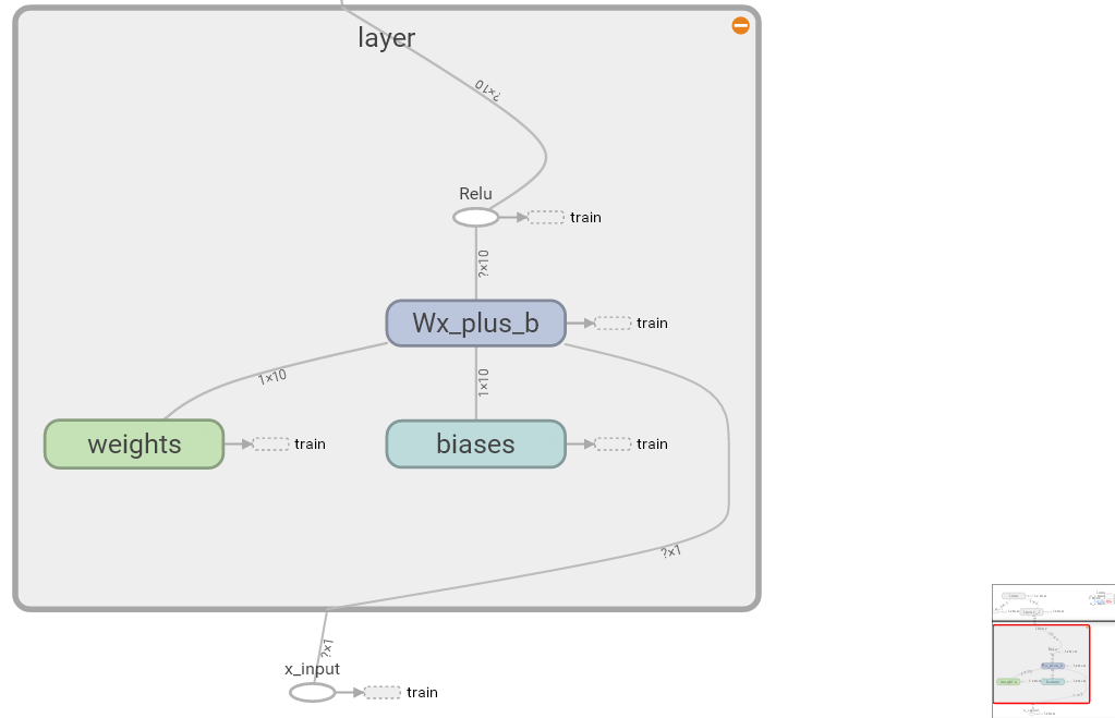 这次我们会介绍如何可视化神经网络。因为很多时候我们都是做好了一个神经网络,但是没有一个图像可以展示给大家看。这一节会介绍一个TensorFlow的可视化工具 — tensorboard :) 通过使用这个工具我们可以很直观的看到整个神经网络的结构、框架。 以前几节的代码为例:相关代码 通过tensorflow的工具大致可以看到,今天要显示的神经网络差不多是这样子的