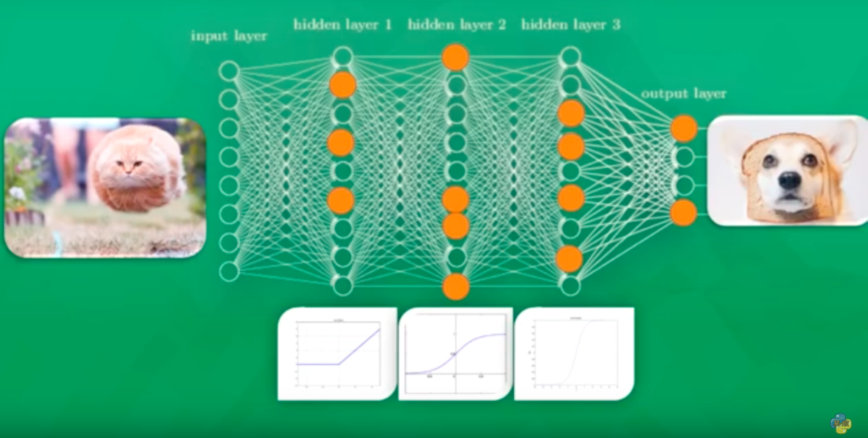 如下图,在这三个中间层中,有激活函数,相当于过滤器或者激活器,作用就是会使一些特征被激活 Activate,同时另一些特征不被激活 Deactivate,