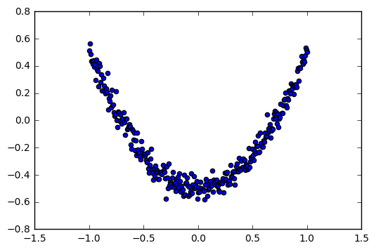 y_data = np.square(x_data) - 0.5 + noise # y = x^2 - 0.5 + wihtenoise